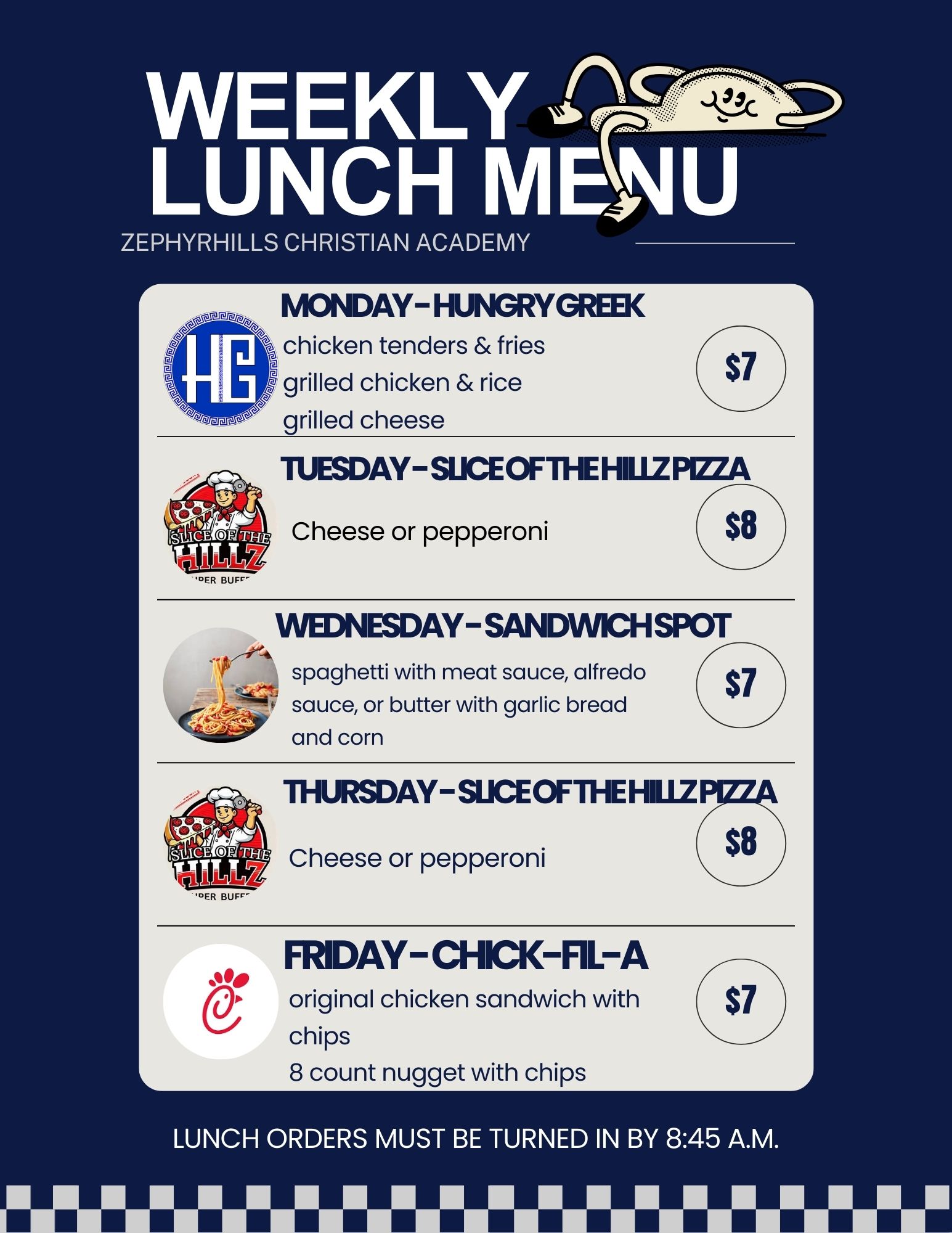 We provide a daily menu from local restaurants. Participation in this program is based upon your child's taste, what your budget may allow, or if you get up late in the morning and need to purchase lunch for convenience. A current menu is available with your child's teacher or in the school office. The menu is subject to change without notice.